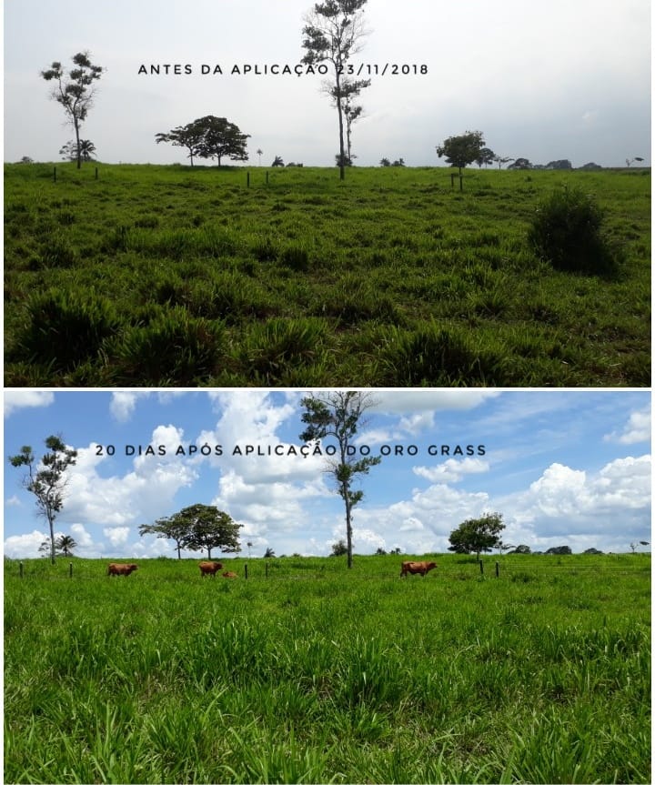 O pasto controle produziu somente 1,6 tonelada de matéria seca (MS) por hectare, já o ORO-GRASS sozinho atingiu 2,4 toneladas e o composto Ureia + ORO-GRASS gerou quase 3,5 toneladas.