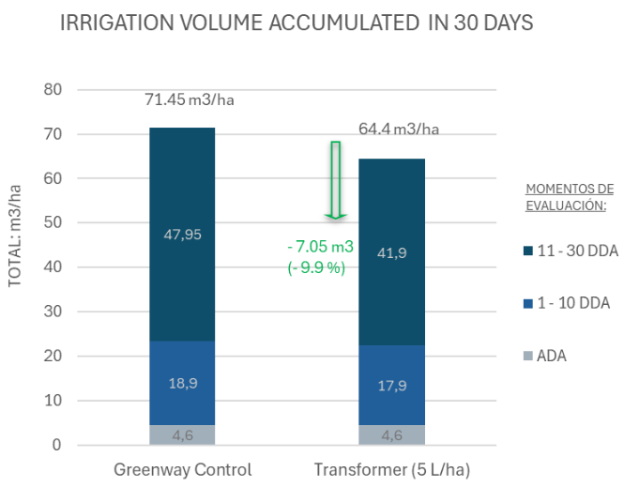 • 5 L/ha de Transformer Ultra, reduziram o volume acumulado de gestão em mirtilos cultivados em substrato em Piura (Peru) em –7,05 m³/ha durante o primeiro mês, mantendo níveis de umidade equivalentes ao controle.